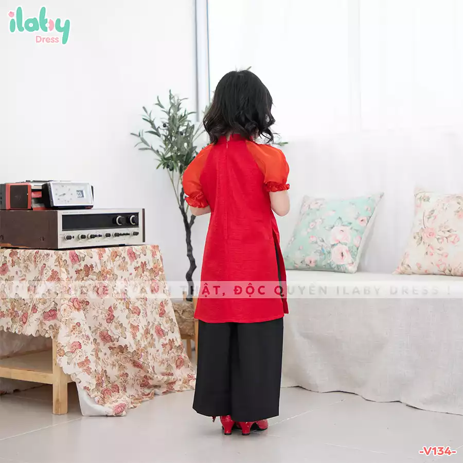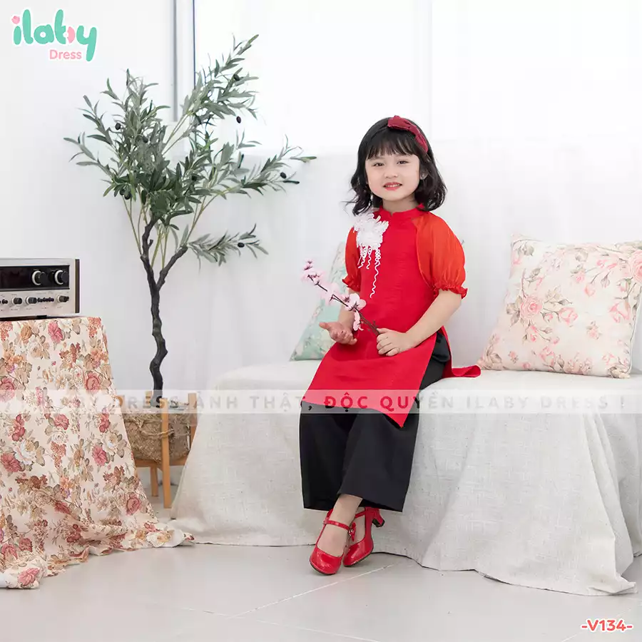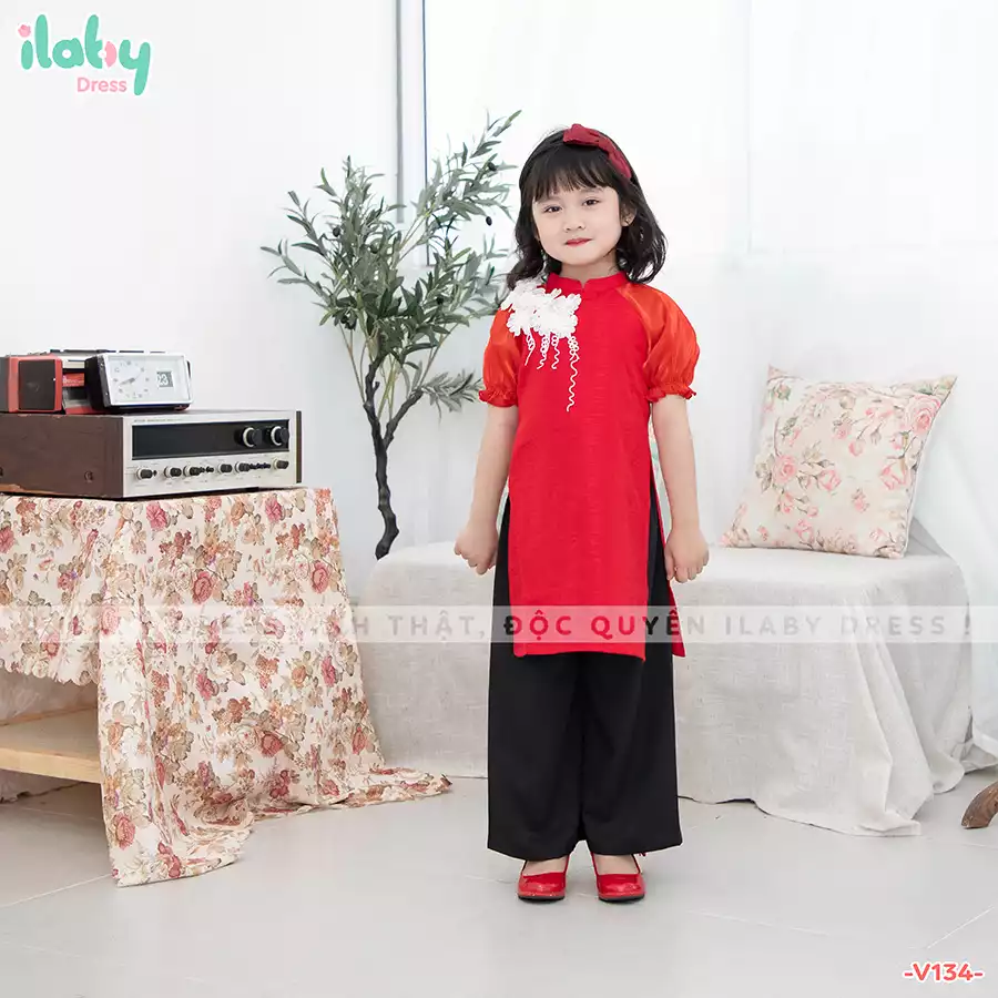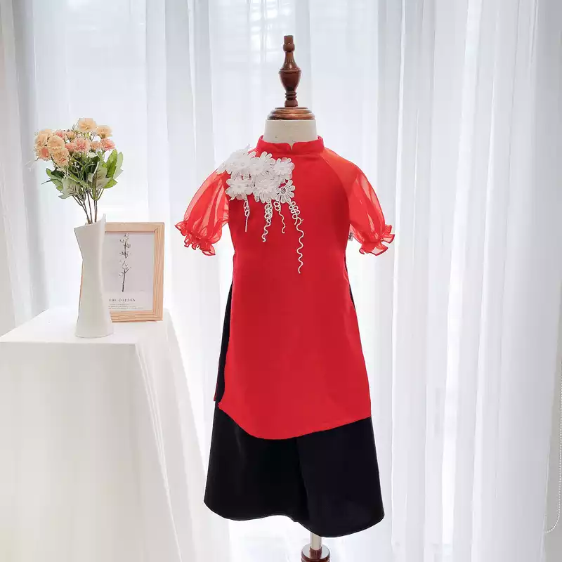 Áo dài đũi đính hoa vai, kèm quần