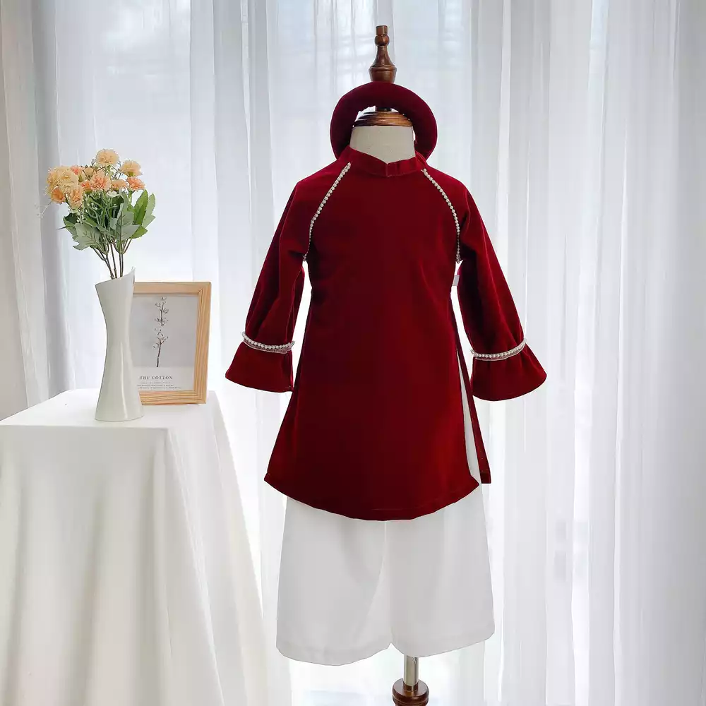 Set áo dài phối ngọc kèm quần và mấn