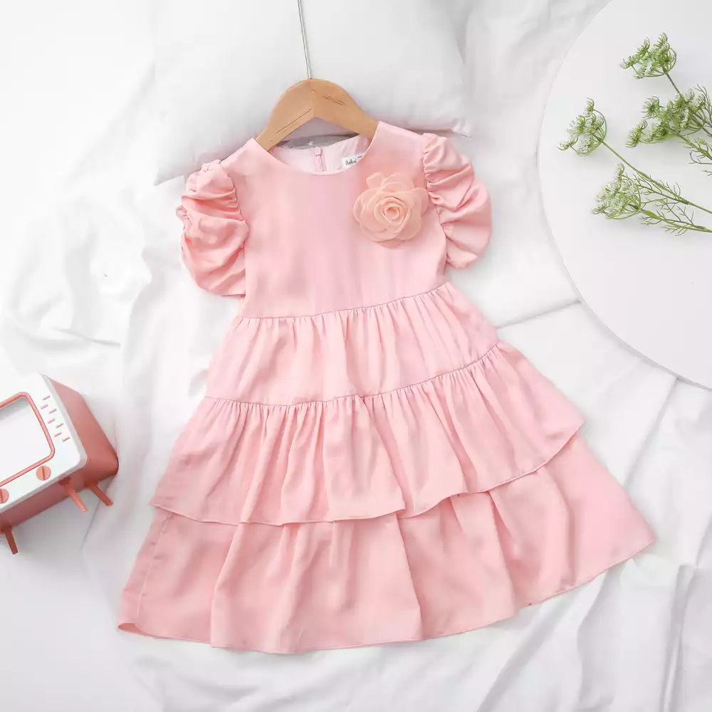 Váy lụa 3 tầng cài hoa trước
